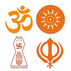 Simbolurile religiilor Dharmice: Om din hinduism, Dharmachakra din budism, Jain Prateek Chihna din jainism și Khanda din sikhism. (de la stânga la dreapta)
