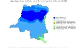 Situat la Ecuator, statul are o climă ecuatorială în mare parte dar și subecuatorială în extremul sud, cu cele mai înalte temperaturi în regiunea centrală. Munții din sud sunt mai calzi și mai arizi, pe când cei din vest sunt mai reci și mai umezi. Peste 60% din această țară mare este acoperită de păduri ecuatoriale care reprezintă aproximativ jumătate din pădurile ecuatoriale ale Africii și aproximativ 5% din totalul de păduri ale planetei.