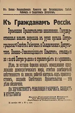Dacă o mână de suporteri a fost în stare să preia controlul asupra capitalei, în fața unui guvern provizoriu pe care nimeni nu-l mai susținea, revolta trebuia acum să fie ratificată de către mase. A doua zi, la 25 octombrie, Troțki anunța oficial dizolvarea guvernului provizoriu după deschiderea Congresului Pan-Rus al Sovietelor Deputaților Muncitorilor și Țăranilor (562 de delegați au fost prezenți, dintre care 382 de bolșevici și 70 din partea socialist-revoluționarilor de stânga(d)[36]