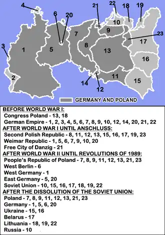 Hartă care prezintă diferențele de graniță și teritorii ale Poloniei și Germaniei în secolul XX, cu zonele actuale deținute de Germania și Polonia în gri închis.