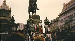 Așa-numita „Revoluție de catifea” a fost revoluția non-violentă din Cehoslovacia care a dus la căderea guvernului său comunist. Pe 17 noiembrie 1989 (vineri), poliția a suprimat demonstrația unor studenți în Praga, cu toate că este încă controversată existența fatalităților. Acel eveniment a cauzat o serie de demonstrații populare din 19 noiembrie până la sfârșitul lunii decembrie. La 20 noiembrie, numărul protestatarilor pașnici adunați în Praga s-a extins de la cei 200.000 din ziua precedentă la aproximativ 500.000. Cinci zile mai târziu, Piața Letná cuprindea 800.000 de demonstranți.[43] Pe 24 noiembrie, întreaga conducere a Partidului Comunist, printre care secretarul-general Miloš Jakeš, și-a dat demisia. O grevă generală de două ore, întreprinsă de toți cetățenii cehoslovaci, s-a sfârșit cu succes pe 27 noiembrie.