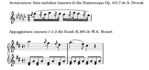 Sincopare cu adăugarea unei mici notă de scurtă durată. Acciaccatura este mica notă tăiată de o linie, fără o durată definită. Appoggiatura este o mică notă, care nu este tăiată, cu o durată egală cu o fracțiune din durata notei imediat următoare.