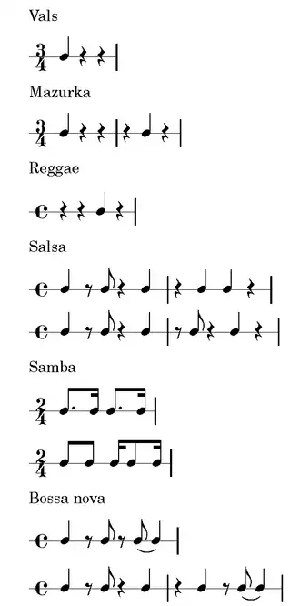 Alte exemple de ritmuri. Pauzele indică duratele neaccentuate. Valsul își are originea în Austria, mazurka în Polonia, muzica reggae în Jamaica, salsa în Cuba și Puerto Rico, samba și bossa nova în Brazilia.