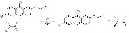 În mediu bazic (OH-), precipită 2-etoxi-6,9-diaminoacridina sub forma unui precipitat galben lăptos. În aceste condiții se elimină o molecula de apă și un ion de lactat.