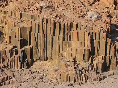 Bazaltul e o lavă foarte fierbinte și fluidă care se răspândește ușor și poate acoperi zone întinse. Pe măsură ce lava se răcește încet, se contractă și se sparge în blocuri cu 5 sau 7 laturi. Crăpăturile se întind de la vârful până la baza rocii, formând o rețea de coloane și stâlpi cu mici deschideri între ei. Exemple: Digul Uriașului, pe coasta Antrim, din Irlanda de Nord, peștera Finegal, din insulele Hebride, Coloanele de bazalt de la Racoș.