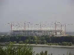 În august 2013, au început lucrările la fundația de nisip aproximativ șase metri de aluviuni pentru stadion. În luna octombrie, a fost construit terenul de sub stadion. Lucrările la movilă pentru zona de stadion a fost finalizat în aluviunile mai 2014. În decembrie șantierul de construcție a început să aducă în echipamente grele, materiale de construcții și echipamente. În ianuarie 2015, el a început de conducere câmp piloți la baza viitorului stadion. În martie 2015, proiectul de stadion a fost modificat, care a redus costul de construcție de 3 miliarde de ruble. În iunie 2015 a fost finalizat piling în pământ și a început construcția standuri stadion. În luna iulie 2015, au început lucrările la construcțiile din beton ale pieselor de deasupra solului ale arenei. În septembrie 2015, unitatea a fost finalizată fundație din dale de beton armat.