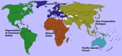 Rusia este unul din cei cinci membri permanenți ai Consiliului de Securitate al ONU. Țara participă la Cvartetul Orientului Mijlociu(d) și la discuțiile hexapartite(d) cu Coreea de Nord. Rusia este membră a Consiliului Europei, a OSCE, și a APEC. Rusia își asumă de regulă rol de conducere în cadrul organizațiilor regionale ca CSI, EurAsEC(d), CSTO, și SCO.[129] Rusia a devenit al 39-lea stat membru al Consiliului Europei în 1996.[130] În 1998, Rusia a ratificat Convenția Europeană pentru Drepturile Omului. Bazele legale pentru relațiile UE cu Rusia le constituie Acordul de Parteneriat și Cooperare cu Rusia, intrat în vigoare în 1997, înnoit în mai 2003.[131][132] După dizolvarea Uniunii Sovietice, la început, Rusia a dezvoltat o relație mai amicală cu Statele Unite(d) și cu NATO(d), dar ulterior, relația cu lumea euro-atlantică s-a deteriorat semnificativ din cauza mai multor conflicte.[133][134] Consiliul de cooperare NATO-Rusia(d) a fost înființat în 2002 pentru a permite Statelor Unite, Rusiei și celor 27 de aliați din NATO să colaboreze pentru exploatarea oportunităților de acțiune comună.[135]