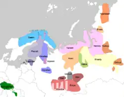 Rușii moderni consideră drept strămoși triburile slave(d), despre care unii specialiști spun că ar fi originare din zonele împădurite ale mlaștinilor Pinsk.[35] Slavii răsăriteni s-au stabilit treptat în vestul Rusiei, în două valuri: unul dinspre Kiev spre actualele Suzdal și Murom și un altul din Polotsk spre Novgorod și Rostov. Începând din secolul al VII-lea, slavii răsăriteni formează cea mai mare parte a populației vestului Rusiei[36] și au asimilat popoarele fino-ugrice(d) băștinașe, inclusiv meria(d), muromii(d), și meșcerii(d), triburile scite și sarmatice iar mai târziu și triburile varegilor de origine germanică.