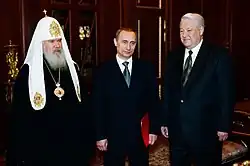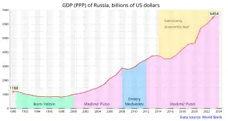 La 31 decembrie 1999, președintele Elțin a demisionat pe neașteptate, lăsând funcția în mâinile recent numitului prim-ministru, Vladimir Putin, care apoi a câștigat alegerile prezidențiale din 2000. Putin a reprimat insurgența cecenă, deși încă mai există violențe sporadice în Caucazul de Nord. Prețul ridicat al petrolului(d) în combinație cu moneda slabă, urmate de creșterea cererii pe plan intern, de consum și investiții au ajutat economia să crească timp de nouă ani consecutivi, îmbunătățind nivelul de trai și crescând influența Rusiei pe scena mondială.[97] După criza economică mondială declanșată în 2008, prețul petrolului a scăzut, și economia Rusiei a stagnat, sărăcia reluându-și creșterea.[98] Deși Putin și-a consolidat un regim autoritar și nedemocratic care suprimă sistematic mișcările de opoziție de orice fel,[99] venirea la putere a lui Putin a coincis cu unele oportunități economice și atitudinea sa fermă împotriva insurgențelor l-a făcut în general popular în Rusia.[100]