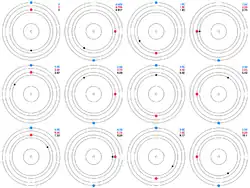 - ↑ This is calculated as follows: for every orbit of Hydra there are orbits of Nix and orbits of Styx. The conjunctions then occur at a relative rate of for Styx-Hydra, for Nix-Hydra and for Styx-Nix. Multiplying all three rates by (to make them integers) yields that there are Styx-Hydra conjunctions and Nix-Hydra conjunctions for every Styx-Nix conjunctions.