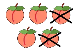 - Dintr-o mulțime, se înlătură (se scade) un număr cunoscut de elemente. Spre exemplu, 5 mere minus 2 mere, rămân 3 mere.