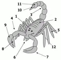 1 - prosomă; 2 - mezosomă; 3 - metasomă; 4 - pedipalp; 5 - picioare; 6 - chelicer; 7 - chelă; 8 - articolul mobil al chelei, manus; 9 - articolul fixal chelei, tarsus; 10 - telson; 11 - anus.