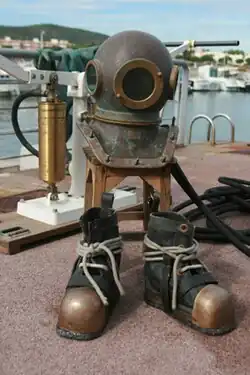 Abia în secolul XIX apar ochelarii de înot, folosiți de scafandrii goi culegători de bureți sau de stridii perliere, în apele calde, și costumele de scafandri grei, din cauciuc, cu cizme de plumb și căști, care erau alimentați cu aer comprimat de la suprafață, mulțumită unui compresor sau pompă (primele erau învârtite cu mâna). Ulterior inginerii francezi Rouquayrol și Denayrouze inventează detentorul, care eliberează aerul comprimat la o presiune proporțională cu adâncimea.