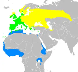 Este o specie indigenă în: Albania, Algeria, Andorra, Arabia Saudită, Armenia, Austria, Azerbaidjan, Bahrain, Bielorusia, Belgia, Bosnia si Herțegovina, Bulgaria, Burkina Faso, Burundi, Capul Verde, Coasta de Fildeș, Congo, Croația, Cipru, Republica Cehă, Danemarca, Djibouti, Egipt, Elveția, Emiratele Arabe Unite, Eritreea, Estonia, Etiopia, Insulele Feroe, Finlanda, Franța, Gambia, Georgia, Germania, Ghana, Gibraltar, Grecia, Guineea, Guineea-Bissau, Iordania, Iran, Irak, Irlanda, Israel, Islanda, Italia, Kazahstan, Kenya, Kuweit, Letonia, Liban, Liberia, Libia, Liechtenstein, Lituania, Luxemburg, Macedonia, Malawi, Mali, Malta, Marea Britanie, Mauritania, Moldova, Muntenegru, Maroc, Niger, Nigeria, Norvegia, Olanda, Oman, Palestina, Polonia, Portugalia, Qatar, România, Federația Rusă (partea asiatică centrală și partea europeană), Senegal, Serbia, Sierra Leone, Slovacia, Slovenia, Somalia, Sudanul de Sud, Spania (și Insulele Canare), Sudan, Suedia, Siria, Tanzania, Tunisia, Turcia, Ucraina, Uganda, Ungaria, Uzbekistan, Yemen, Zambia.