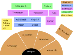 Orchestra, așa cum se regăsește ea la sfârșitul tranziției către clasicism, este formată din instrumente cu coarde și arcuș (vioară, violă, violoncel, eventual contrabas sau un echivalent), suflători de lemn (flaut, oboi, fagot), corni și timpane. Începând cu ultimele simfonii de J. Haydn, în orchestră sunt cerute trompete și clarinet (care nu este utilizat într-un număr mare de simfonii de W.A. Mozart). Sub influența operei lirice, se adaugă mai târziu cornul englez, contrafagotul, suflătorii de alamă cu ambitus mai grav decât cornul francez (trombonul, tuba) și harpa. Acestora se adaugă vocea umană, așa cum a fost ea consemnată mai întâi în Simfonia a IX-a de L. van Beethoven. Pentru comparație, urmăriți instrumentația unor simfonii și cicluri de simfonii: