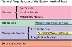 Sistemul nervos enteric constă din aproximativ 500 de milioane de neuroni[4] (inclusiv diferitele tipuri de celule Dogiel),[5] adică 1/200 din numărul de neuroni din creier. Ganglionii care conțin corpii neuronali și celulele gliale sunt conectați prin fascicule de axoni pentru a forma plexurile mienteric (Auerbach) și submucos (Meissner) care se întind de la nivelul esofagului și până la sfincterul anal.[6] Plexul mienteric este localizat între straturile intern circular și extern longitudinal ale tunicii musculare, iar plexul submucos este localizat în submucoasă, la nivelul interfaței acesteia cu stratul intern circular al muscularei.[1] În general, plexul Auerbach controlează motilitatea, iar plexul Meissner este implicat în funcția de secreție.[7][8]