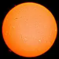 Soarele este steaua sistemului solar și de departe cel mai important component al acestuia. Masa sa mare (egală cu 332.900 de mase terestre)[52] produce în nucleul său temperaturi și densități suficient de ridicate ca să susțină fuziunea nucleară,[53] care eliberează o cantitate enormă de energie, din care cea mai mare parte radiază în restul sistemului sub formă de radiații electromagnetice, cu vârful situat în spectrul de 400-700 nm al luminii vizibile.[54]