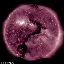 Imagine realizată în 2010 în culori false,[1] văzută în lumina ultravioletă (lungime de undă de 30,4 nm) | |