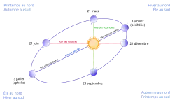 - Orbita terestră nu este deloc circulară, iar viteza Pământului pe orbită depinde, prin urmare, de poziția sa (A doua lege a lui Kepler). În consecință, anotimpurile au o durată inegală: