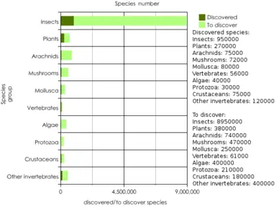Conform unor estimări, pe Terra ar putea fi între 30 de milioane și 50 de milioane de specii, incluzând aici și virușii și bacteriile, cea mai mare parte dintre ele, aproximativ 90%, trăind în ecosistemul tropical.[2] Printre acestea, 750.000 sunt insecte (din care 20.000 de fluturi), 250.000 plante și 42.000 vertebrate.[2]