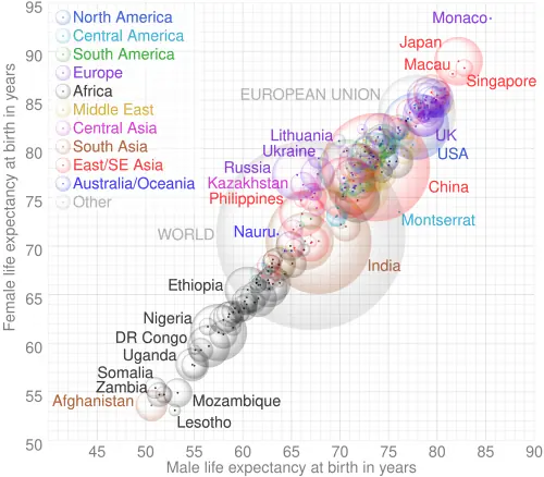 Femeile tind să aibă o rată a mortalității mai mică la toate vârstele. Aproximativ 90% dintre persoanele care au 110 ani sunt femei, iar procentul crește și mai mult la vârste mai înaintate. Diferența medie între sexe este de aproximativ 5 ani pe plan mondial. În Rusia, Ucraina și Bielorusia bărbații trăiesc cu 10 ani mai puțin, în medie, din cauza consumului de alcool și a violenței.