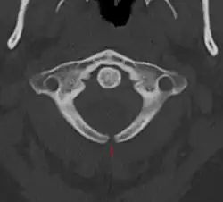 Este forma cea mai ușoară(ascunsă) a spinei bifide.[1] La această afecțiune, cum se vede și în imaginea radiografiei, partea exterioară a vertebrelor nu este complet sudată.[2] Despicătura dintre vertebre este atât de măruntă încât măduva spinării nu herniază. Pielea în zona leziunii poate să apară normală dat poate să crească și câteva fire de păr sau să apară un nev.[3]