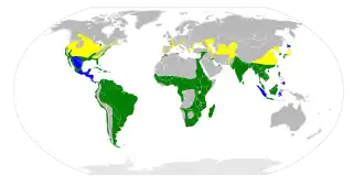 | Aria de răspândire a N. nycticorax Aria de clocire Tot anul Aria de iernat | |