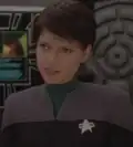 | Kira Nerys este un ofițer de miliție bajoran, fostă luptătoare de gherilă în timpul ocupației cardassiene a Bajorului, și, în calitate de ofițer de legătură al stație, secundul lui Sisko. Inițial, ea privește cu suspiciune intențiile Federației cu privire la planeta ei, dar ajunge să capete încredere și să se împrietenească cu membrii echipajului. Asemenea majorității bajoranilor, Kira este profund religioasă, ceea ce o face uneori să se simtă ciudat avându-l pe emisar drept comandant. Ro Laren, un personaj din Star Trek: Generația următoare, fusese prima alegere a producătorilor pentru funcția de secund al lui Sisko, dar Michelle Forbes nu a dorit să se dedice total unui serial de televiziune.[7] | |||||