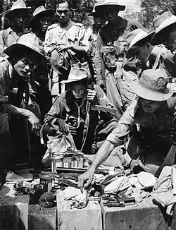 Membrii Regimentului Regal Malaez din timpul situației de urgență malaeziană din 1949, inspectează echipamentele capturate într-un atac.