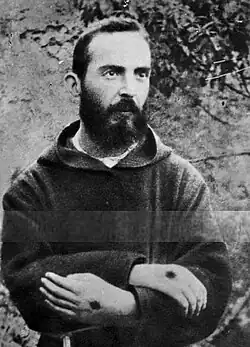 Sfântul Francisc de Assisi este primul stigmatizat pe care istoria creștinismului îl înregistrează.[12] În 1224, cu doi ani înainte de moartea sa, Francisc se îmbarcă într-o călătorie către mănăstirea La Verna pentru un post de 40 de zile. Într-o dimineață din preajma sărbătorii Înălțării Sfintei Cruci, se spune că lui Francisc i-a apărut un înger cu șase aripi(serafim) în timp ce se ruga. Pe când îngerul se apropia, Francisc a putut să vadă că îngerul era crucificat. Înfățișarea sa era umilă și inima sa era plină cu exaltare și bucurie amestecată cu durere și suferință. Când îngerul s-a depărtat, se spune că Francisc a rămas cu stigmatele pe mâini, picioare și în lateral ca și când ar fi vorba de aceeași lance care a străpuns coasta lui Hristos. Urmele cuielor au apărut atunci pe mâinile și picioarele sale și rana din dreptul coastei adesea picura sânge.[13]