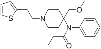 | InChI | InChI=InChI=1S/C22H30N2O2S/c1-3-21(25)24(19-8-5-4-6-9-19)22(18-26-2)12-15-23(16-13-22)14-11-20-10-7-17-27-20/h4-10,17H,3,11-16,18H2,1-2H3[3] |