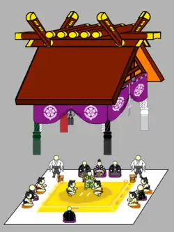 Arbitrul este numit gyōji, care este îmbrăcat în costum purtat de nobilii de la Curtea Imperială în secolul al XIV-lea.[6]