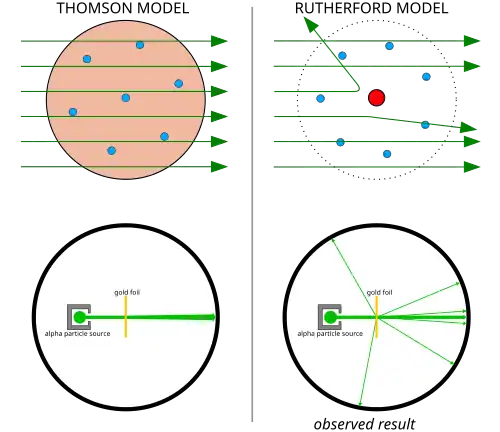 În experimentul Geiger–Marsden(d), Hans Geiger și Ernest Marsden(d) (colegi ai lui Rutherford care lucrau la sugestia lui), au propulsat particule alfa către foi subțiri de metal și au măsurat deformarea lor prin utilizarea unui ecran fluorescent.[13] Dată fiind masă foarte mică a electronilor, impulsul mare al particulelor alfa și concentrația scăzută a sarcinii pozitive în modelul budincii de prune, experimentatorii se așteptau ca toate particulele alfa să treacă prin folia metalică fără devieri semnificative. Spre surprinderea lor, o fracțiune mică din particulele alfa au fost puternic deviate. Rutherford a concluzionat că sarcina pozitivă a atomului trebuie să fie concentrată într-un volum foarte mic care produce un câmp electric suficient de intens pentru a devia particulele alfa atât de puternic.