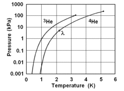 unde presiunea este în Pa,[22] iar pentru coeficienții Ai, B, C a se vedea articolul ITS-90. Pentru 4He, deși coeficienții aceastei relații sunt stabiliți pentru temperaturi de la 1,25 K în sus, relația este considerată valabilă începând de la temperatura de 0,5 K, chiar mai joasă decât cea de 0,65 K specificată de ITS-90.[29]