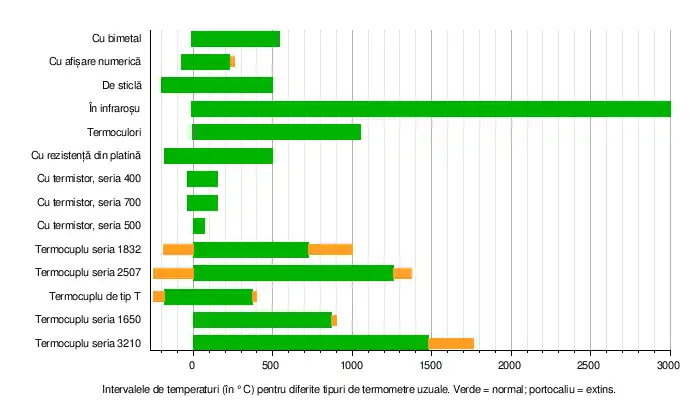 Intervalele de temperaturi pentru care se fabrică termometre uzuale de diverse tipuri sunt următoarele:[13]
