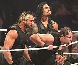 - Irish whip a lui Reigns pe Rollins ca să aplice un antebraț sparge la un adversar încolțit, urmat de un sărind rufe a luI Reigns