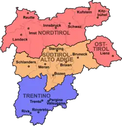 Regiuni cuprinse astăzi în Euroregiunea Tirol - Tirolul de Sud - Trento. Tirolului istoric îi mai aparțineau și Cortina d’Ampezzo, Livinallongo del Col di Lana, Colle Santa Lucia (BL), Valvestino, Magasa (BS) și Pedemonte (VI).