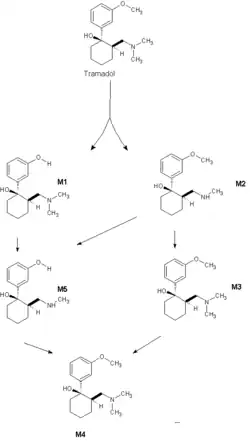 - izoforma CYP2D6 (ca și codeina) acționează la nivelul atomilor de O și N la 5 metaboliți diferiți. Dintre aceștia, metabolitul 1 are cea mai selectivă acțiune, având o afinitate de circa 200 ori mai mare pentru receptorii miu, decât tramadolul și având un timp de înjumătățire de 9 ore comparativ cu cele 6 ore ale tramadolului. Se pare că un procent de circa 6% din populația globului are o activitate mult mai lentă a CYP2D6, ceea ce duce în cazurile respective la o reducere a efectului analgezic. Faza a II a metabolismului hepatic duce la formarea de metaboliți solubili în apă și în consecință apți pentru eliminarea renală.