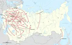 ![]() Principalele rute de deportarea în timpul procesului de dezchiaburire din URSS în perioada 1930–1931 | |