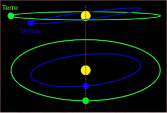 În cea mai mare parte a cazurilor, când planetele Venus și Pământ sunt în conjuncție, ele nu sunt aliniate cu Soarele. Orbita lui Venus este înclinată cu 3,4° în raport cu orbita Pământului și trece, prin urmare, pe cer, deasupra (sau dedesubtul) Soarelui.[4] Observată de pe Pământ, Venus în conjuncție inferioară poate fi distanțată până la 6° de Soare deși înclinația nu este decât 3,4°. Cum diametrul unghiular al Soarelui este de circa 1/2 de grad, Venus trece atunci deasupra sau dedesubtul Soarelui la peste 18 diametre solare.[4] Tranzitul se produce când cele două planete sunt în conjuncție în momentul (sau aproape în momentul) în care ele trec linia de intersecție a planurilor orbitale.