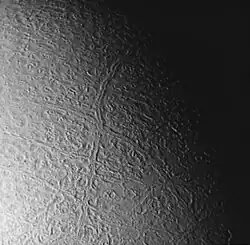 Dungi întunecate pe suprafața calotei polare de sud a lui Triton, despre care se crede că sunt depozite de praf lăsat de erupțiile gheizerelor de azot
