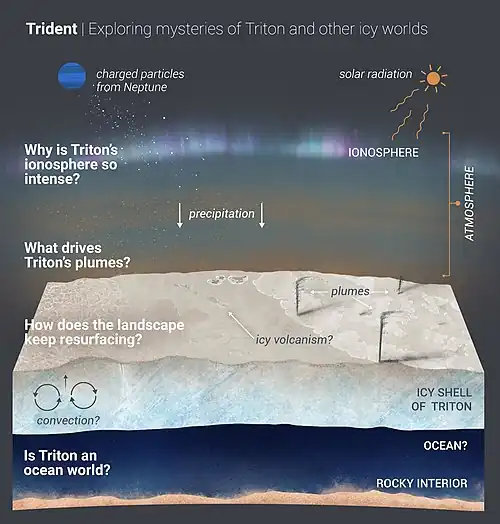 În timpul zborului său din 1989 către Triton, Voyager 2 a găsit temperaturi la suprafață de −235 °C (38 K) și, de asemenea, a descoperit gheizere active care erup azot gazos sublimat, contribuind la o atmosferă de azot slabă cu o presiune mai mică decât 1⁄70,000 din cea a atmosferei Pământului la nivelul mării. Voyager 2 rămâne singura sondă spațială care l-a vizitat pe Triton. [12] Deoarece sonda a putut studia doar aproximativ 40% din suprafața satelitului, au fost propuse misiuni viitoare pentru a revizui sistemul Neptun cu accent pe Triton.
