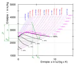 - unde ht este căderea (diferența) totală de entalpie, exprimată în (kJ/kg) într-o transformare izentropică pornind din starea inițială a aburului și până la presiunea finală;