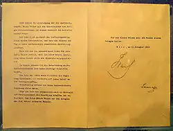 - aceeași zi - Declarația de renunțare a împăratului Carol I al Austriei, prin care arată că „nu dorește să fie o piedică pentru viitorul popoarelor sale iubite”. Ofițerii, funcționarii publici și cei asimilați acestora sunt dezlegați de jurământul de credință față de împărat.