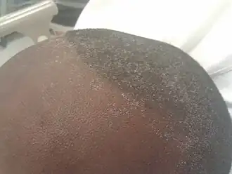 ![]() Îngheț uremic prezent pe fruntea și scalpul unui tânăr care s-a prezentat cu plângeri de anorexie și oboseală, cu blood urea nitrogen și creatinină de aproximativ 100 și, respectiv, 50 mg/dl. | |