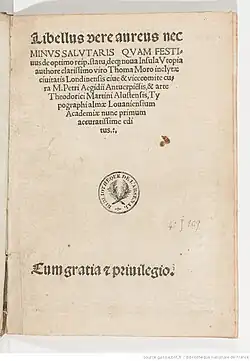 „Utopia”. The American Cyclopædia. .- Utopia[nefuncțională – arhivă] – Imagini fotocopiate din ediția din 1518 a Utopiei, din colecția Folger Shakespeare Library(d)