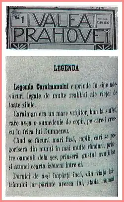 Legenda muntelui Caraiman a apărut în anul 1927 în revista Valea Prahovei, după cum urmează:[3]