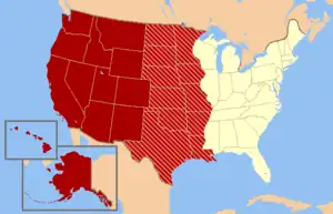 Definițiile regionale ale Vestului American pot diferi mult de la o sursă la alta. Statele colorate în roșu închis sunt, de obicei, incluse în ceea ce este azi considerat Vestul American, în timp ce restul de state, colorate/hașurate în roșu mai deschis, sunt doar uneori considerate parte a aceluiași Vest. Harta nu reprezintă o definiție istorică a vestului SUA aplicabilă pentru deceniile de dinaintea expansiunii către apus a țării, prin achiziția teritoriilor cunoscute ca: Alaska, Hawaii, Oregon, Louisiana și Cesiunea Mexicană.