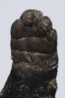 Laba anterioară (în stânga) și cea posterioară (în dreapta). Degetele se dezvoltă împreună pe ambele membre, în plus, în cazul membrelor posterioare, ele sunt unite până la ultima falangă, ceea ce duce la transformarea labelor posterioare în înotătoare. Lungimile degetelor de pe laba posterioară se schimbă într-o altă ordine decât la majoritatea mamiferelor, micșorându-se treptat de la al cincilea spre primul. |