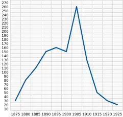 | Evoluția vânării vidrelor de mare pe insulele Comandorului în perioada anilor 1870-1924 (conform materialelor arhivei vânătorești a insulelor Comandorului[8]) | Evoluția cantității de blănuri de vidră de mare licitate la Londra în perioada anilor 1871-1910 (mii de bucăți; conform registrelor de la burse[47]) |